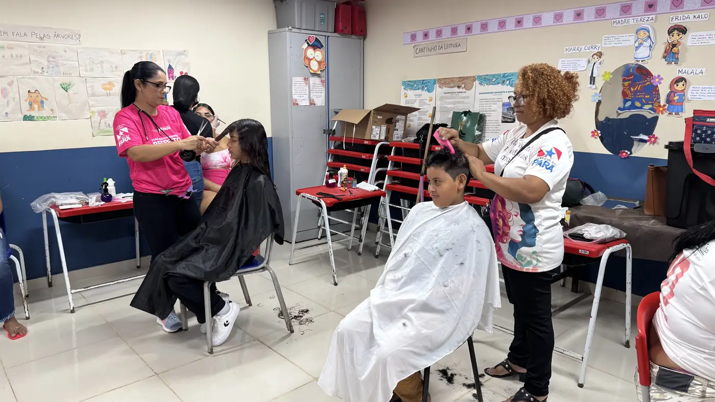 Assistência Social e Cuidados:Profissionais especializados dão ParáPaz ofereceram orientações sobre benefícios sociais, auxiliando no esclarecimento de dúvidas sobre direitos e proteção à mulher. Já as equipes da SEMU ofertaram serviços de autocuidado, como corte de cabelo, design de sobrancelha e esmaltação de unhas.